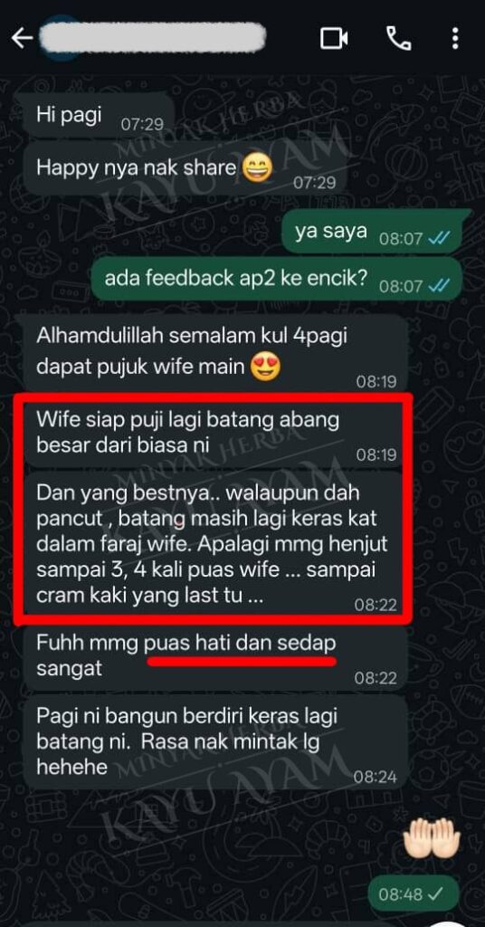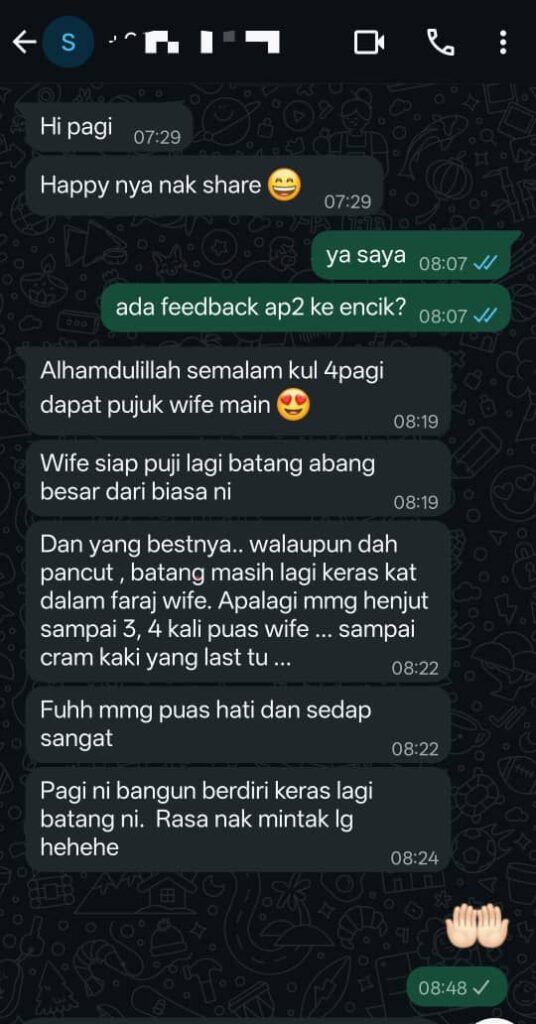 👉 Ya, bila zakar lebih keras, tahan lama dan bertenaga, pasangan akan lebih puas. Ramai isteri akui hubungan jadi lebih hangat dan mesra selepas suami guna minyak ini.