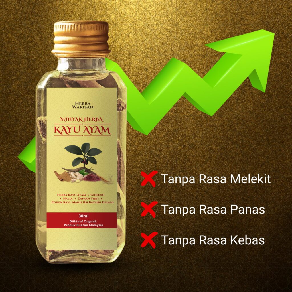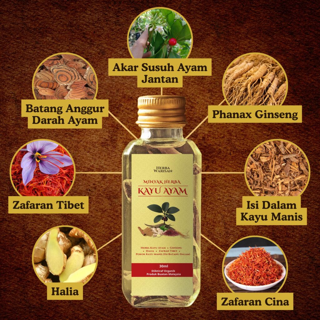 Minyak Herba Kayu Ayam diformulasikan khas untuk membantu lelaki yang mengalami masalah zakar lembik, cepat lemah dan kurang bertenaga. Gabungan 7 herba premium daripada warisan Melayu dan perubatan Cina seperti Akar Susuh Ayam, Akar Batang Anggur Darah Ayam, Ginseng, Kayu Manis, Halia serta Zafaran Tibet dan Zafaran Cina berfungsi melancarkan darah, menguatkan tenaga batin dan memulihkan kejantanan secara semula jadi, selamat serta terbukti turun-temurun.